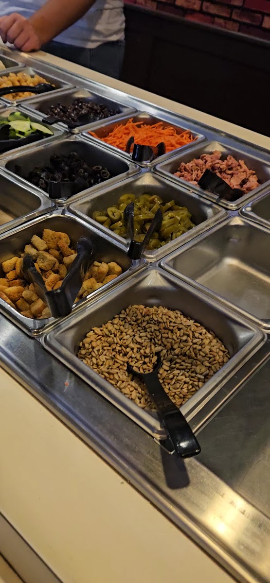 We got three pizzas. The Hawaiian, pepperoni, and the parm. We will definitely be going back to try the Brisket pizza. It seems to be the most popular. The pizzas. Tasted good, the taste took me to an old pizza parlor. The salad bar is awesome! I got mine to go, but it was delicious and they many topping options to pick from.