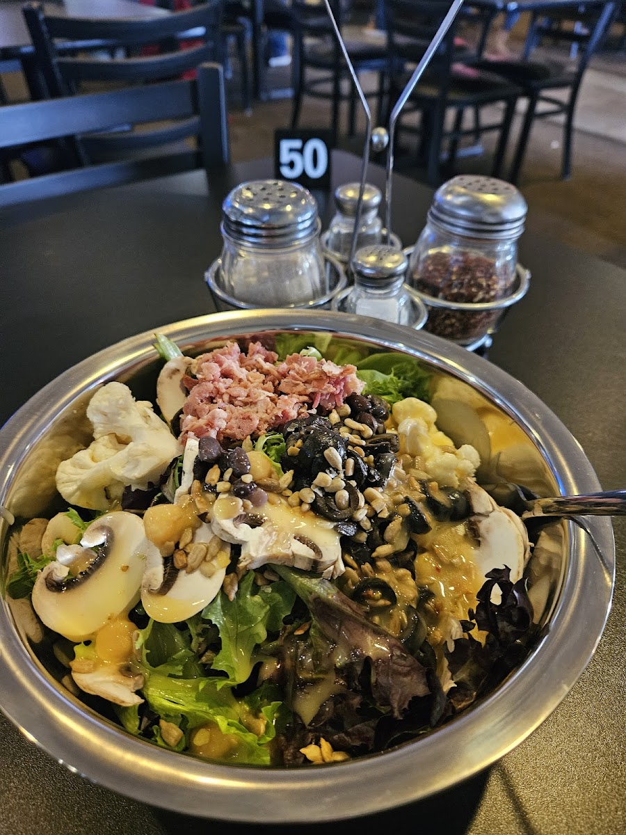 Stop by for the happy hour special. Slice of pizza up to 3 toppings and the salad bar for $12. Love the house made ranch and the fully stocked salad bar made a couple trips. I like when tavern style pizza is crispy on the bottom it was so good pepperoni, Canadian bacon and pineapple, going to have to get a full size pizza next !